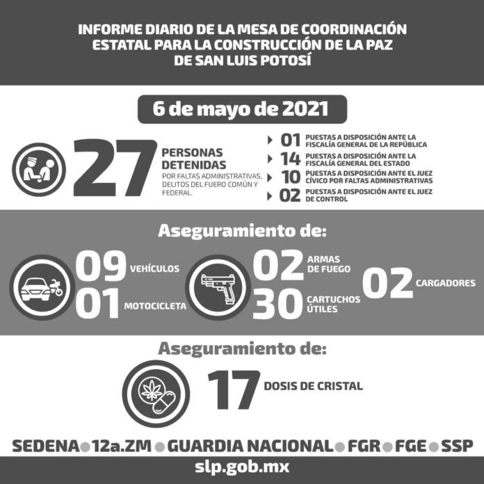 Mediante las diversas acciones y operativos realizados de forma conjunta por las corporaciones de seguridad en San Luis Potosí, la Mesa Estatal para la Construcción de la Paz informa la detención de 27 personas que fueron puestas a disposición de las autoridades correspondientes.