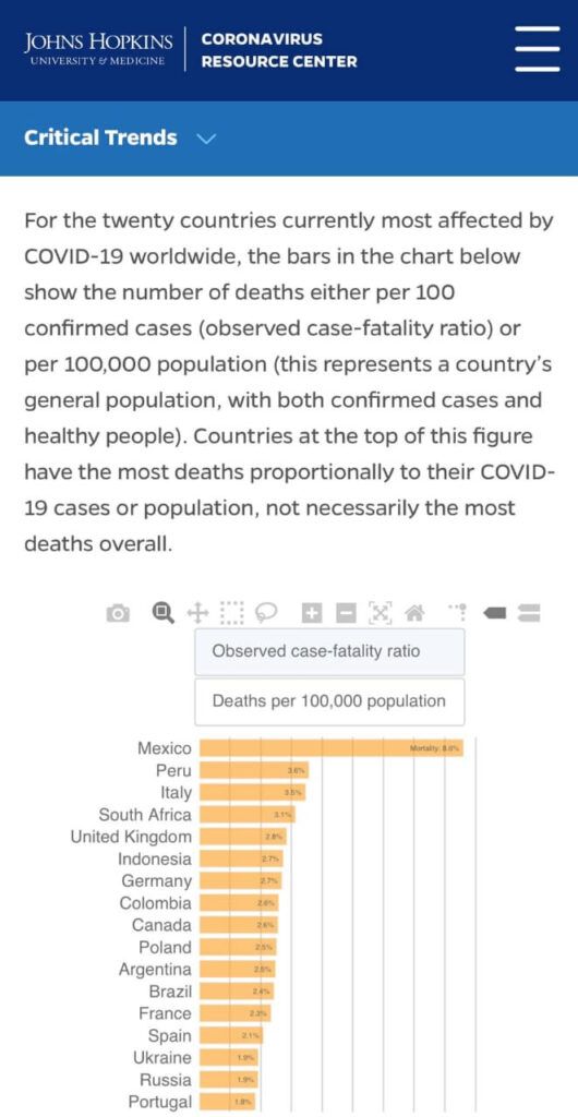La institución encargada de llevar el conteo oficial de la pandemia de COVID-19 publicó un apartado llamado “Tendencias Críticas” en donde analiza la incidencia mortal de los 20 países más afectados en ese departamento y, lamentablemente, México tiene un índice de más del doble respecto al segundo lugar.