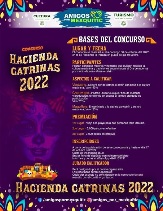 El próximo domingo 30 de octubre, en la Hacienda la Parada (Mexquitic) en punto de las 19:00 horas, se realizará el “Concurso de Hacienda Catrinas”; el certamen organizado por la asociación “Amigos por Mexquitic”.