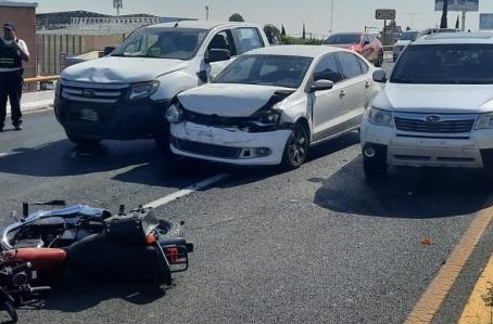 Motociclista ocasionó aparatosa carambola y cierre durante más de una hora, a la circulación vehicular en ese lugar, en Salvador Nava, en la cima del puente de 5 de Mayo.