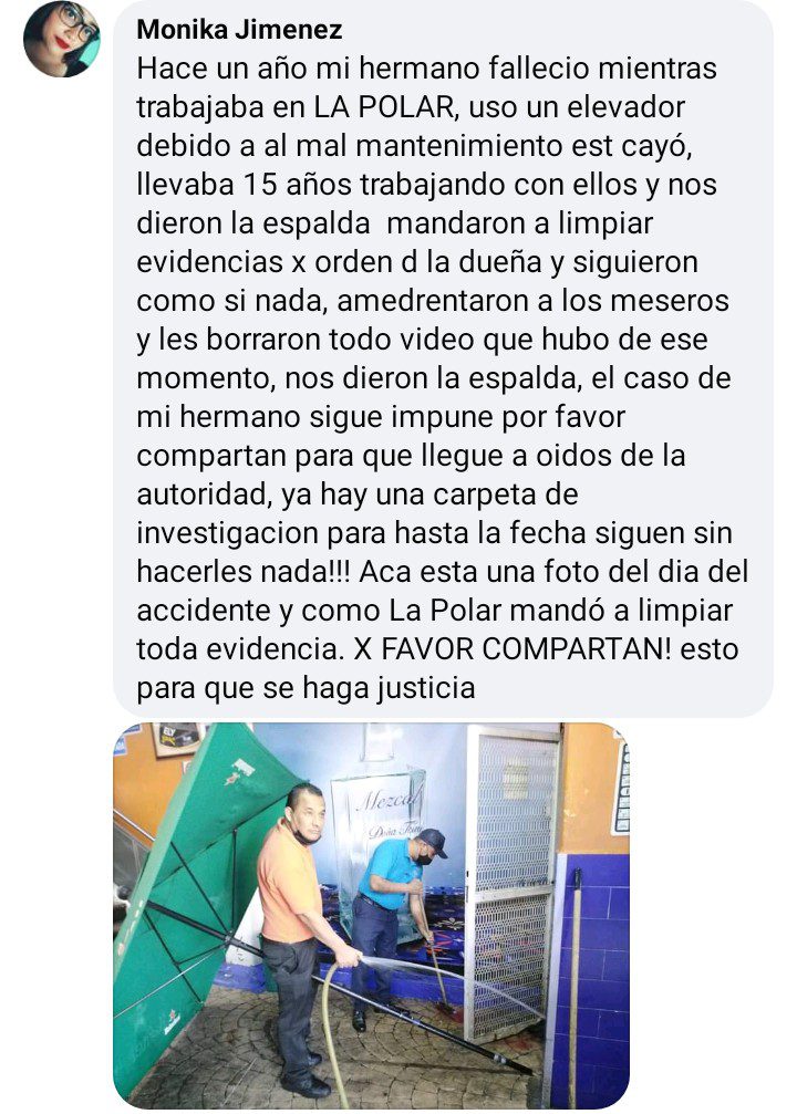 Según cuentan los familiares de la víctima, Fernando Jiménez Espinoza tenía 15 años trabajando en el restaurante “La Polar” como mesero y cocinero. El 5 de Diciembre del 2021, mientras se encontraba laborando, un elevador montacargas cayó encima de el debido a las malas condiciones en las que se encontraba. Fernando intentó alcanzar a un cliente que no pago su cuenta, para hacer más rápido el trayecto decidió pasar por debajo del elevador montacargas. Este ascensor ya había presentado fallas, y lamentablemente ese día aplastó a Fernando, causándole múltiples fracturas graves y finalmente la muerte.