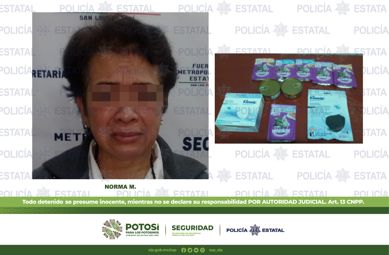 Luego de atender el reporte, los agentes Estatales se movilizaron a un comercio ubicado sobre Avenida Chapultepec, lugar en donde detuvieron a Norma M., de 60 años de edad, después de que fue señalada como presunta responsable de hurtar varios sobres de alimento para gato, así como artículos de abarrotes y de farmacia.