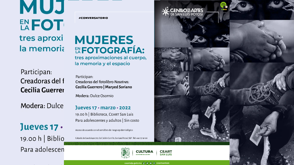 Por lo anterior, la Secretaría de Cultura de San Luis Potosí, invita al conversatorio “Mujeres en la fotografía: tres aproximaciones al cuerpo, la memoria y el espacio”, en el que participarán la creadoras Cecilia Guerrero y Maryed Soriano, en un diálogo moderado por la también artista visual Dulce Osornio, que tendrá lugar este jueves 17 de marzo 2022, a las 19:00 h, en la Biblioteca del Centro de las Artes de San Luis Potosí con entrada libre.