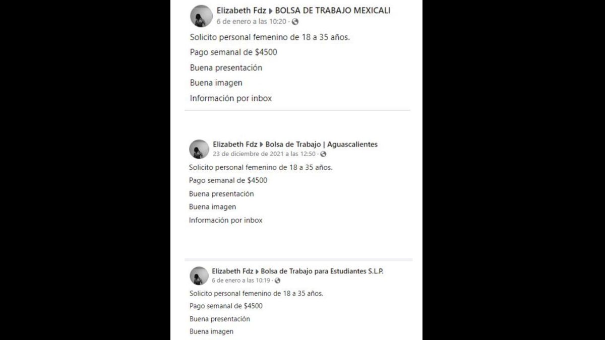 Es un perfil falso o previamente hackeado y que aparece con el nombre de Elizabeth Fdz, desde donde se reclutan a jóvenes para supuestos trabajos de mesera y edecán erótica, para servicios exclusivo de clientes solventes.