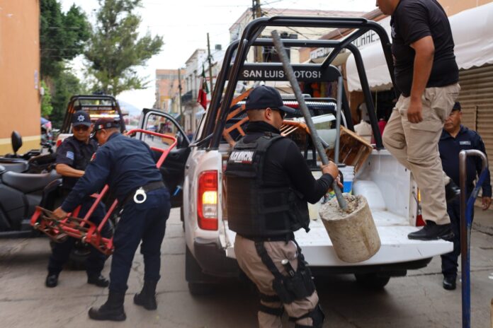 SANTA MARÍA DEL RÍO. – El H. Ayuntamiento de Santa María del Río, a través de la Dirección de Seguridad Pública y Tránsito Municipal, implementó el operativo “Barredora”, una acción enfocada en retirar objetos, materiales y estructuras que obstruyen o alteran la vía pública.