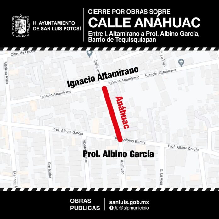 Con el propósito de continuar la rehabilitación de las vialidades de la ciudad, el Gobierno Municipal de San Luis Potosí, a través de la Dirección de Obras Públicas, informa a la ciudadanía que será cerrada la circulación de la calle Anáhuac, en el tramo de Ignacio Altamirano a prolongación Albino García en el Barrio de Tequis.