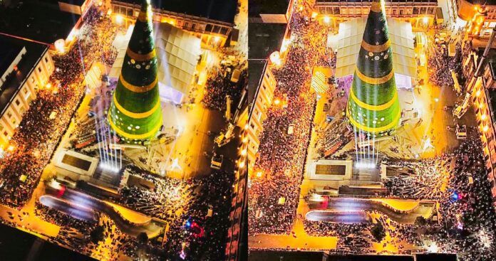 SLP. – La Navidad llegó este jueves a San Luis Potosí con el encendido realizado por el Gobernador Ricardo Gallardo Cardona del árbol Navideño más imponente de México y Latinoamérica, un pino de 70 metros de altura, ubicado en el centro de la plaza de Los Fundadores, ante la presencia de miles de potosinas y potosinos, que quedaron maravillados por el mágico espectáculo.