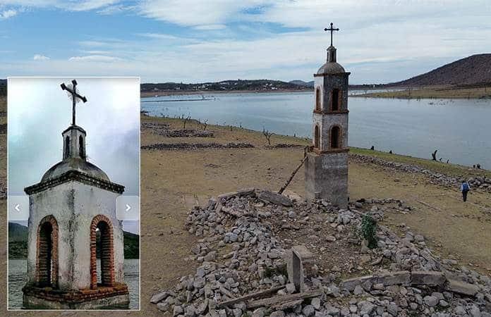 Paradójicamente, y a pesar de que aparece ganado muerto que ya empieza a quedar esparcido por la sequía prolongada, la presa “La Muñeca”, en Tierra Nueva, ofrece un inusual espectáculo. La original capilla del Señor de La Piedad, muestra completa su única torre de campanario que sigue en pie, luego de que en cuatro décadas se ha derruido paulatinamente en medio de las condiciones de humedad y salitre.
