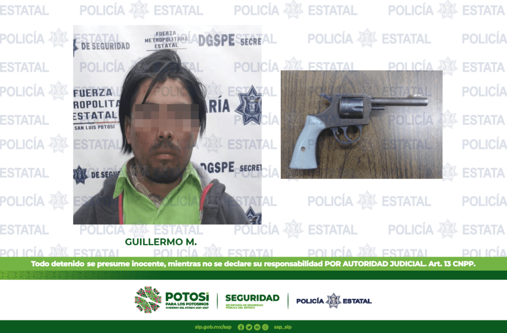 Uno de los hechos fue durante los operativos realizados en la carretera estatal 15 en la comunidad El Rosario del municipio de Salinas de Hidalgo, agentes Estatales detuvieron a Guillermo M., de 29 años de edad a quien se le aseguró un arma de fuego, tipo revólver sin cartuchos útiles.