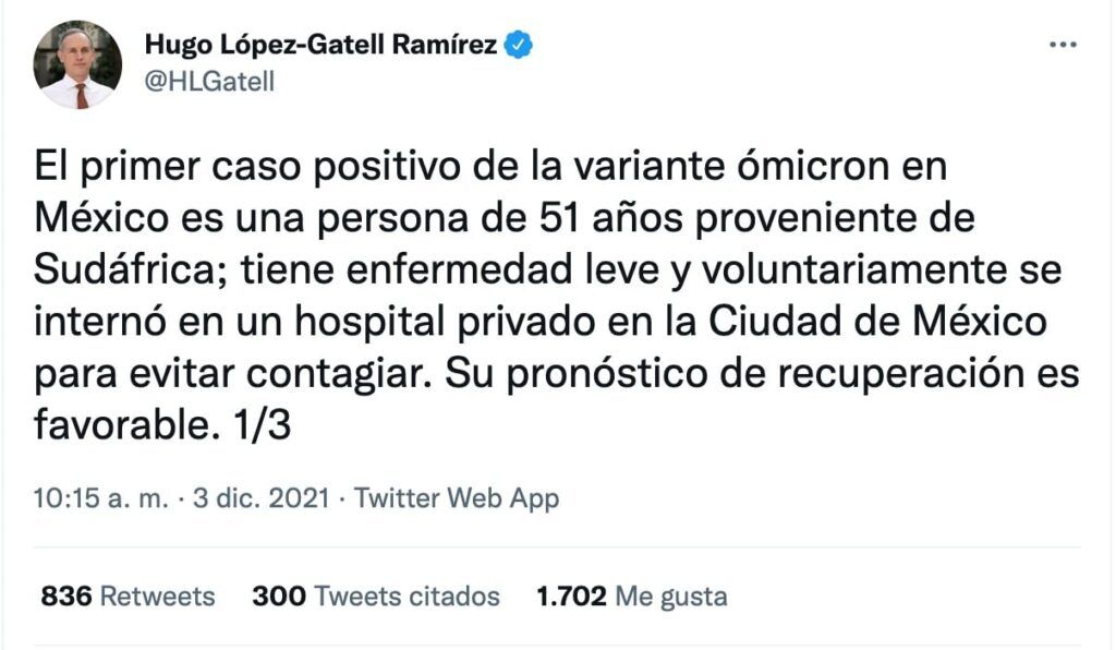 Hugo López Gatell, subsecretario de Prevención y Promoción de la Salud, confirmó el primer caso positivo de la variante ómicron en México.