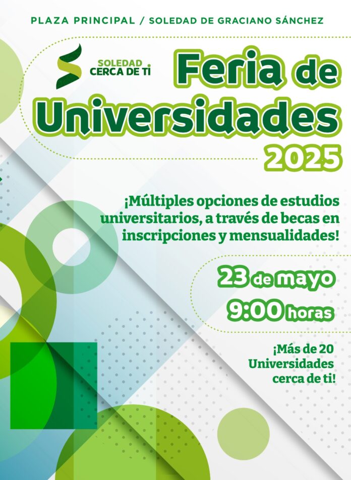 Con el propósito de impulsar el desarrollo académico de la juventud y estrechar la colaboración entre el gobierno local y la comunidad estudiantil, el Ayuntamiento de Soledad de Graciano Sánchez celebrará una nueva edición de la Feria de Universidades el próximo viernes 23 de mayo en la Plaza Principal del municipio.