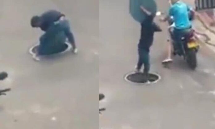En Medellín Colombia, quedó grabado en video el momento exacto de cuando un ladrón intentó robar una tapa de alcantarilla, aunque el final del material fue el inesperado: el hombre, en vez de salir victorioso con su botín, se golpeó en su intento de hurto.