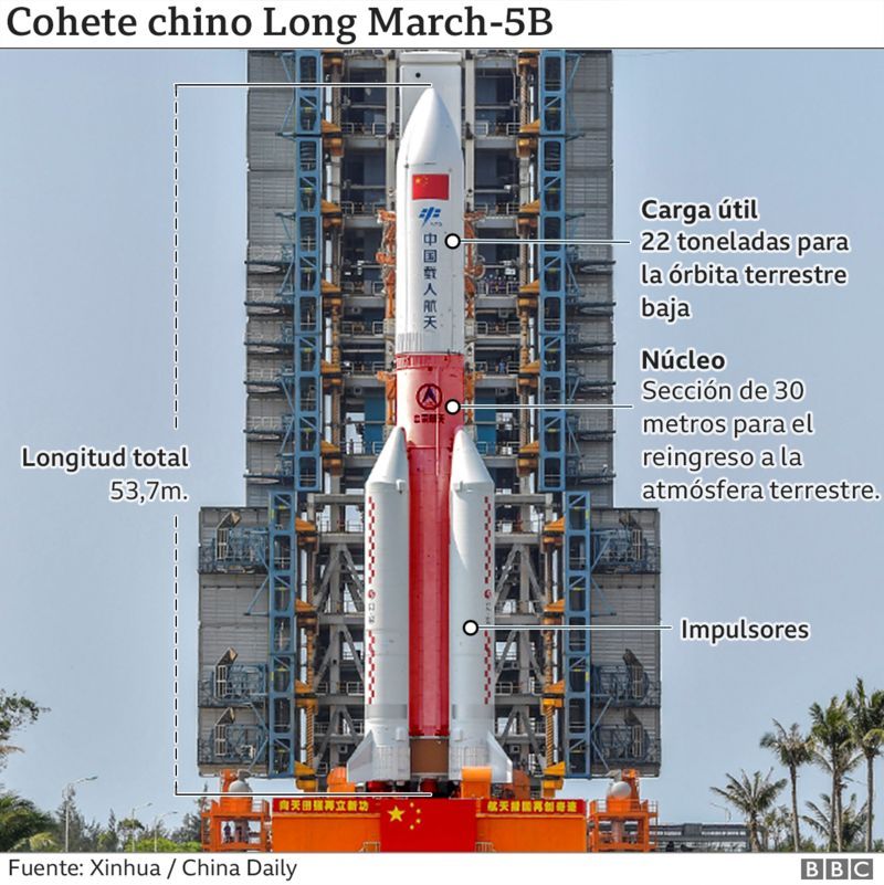 El Long March 5B despegó de la isla de Hainan el 29 de abril con el módulo “Tianhe”, que contiene lo que se convertirá en el alojamiento de tres tripulantes en una estación espacial china permanente.