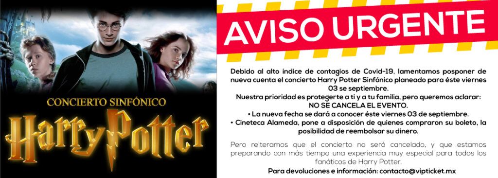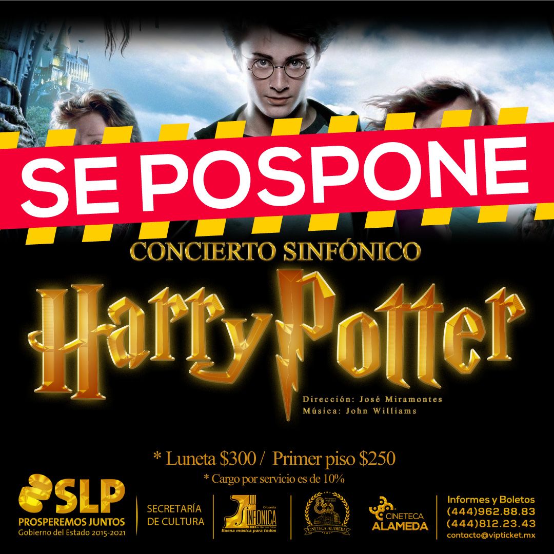 La Secretaría de Cultura de San Luis Potosí, anuncia que el Concierto Sinfónico Harry Potter, que se llevaría a cabo el viernes 3 de septiembre, se pospone hasta nueva fecha, con el objetivo de salvaguardar la salud de las personas que asistirían al concierto, así como de integrantes de la Orquesta Sinfónica de San Luis Potosí.