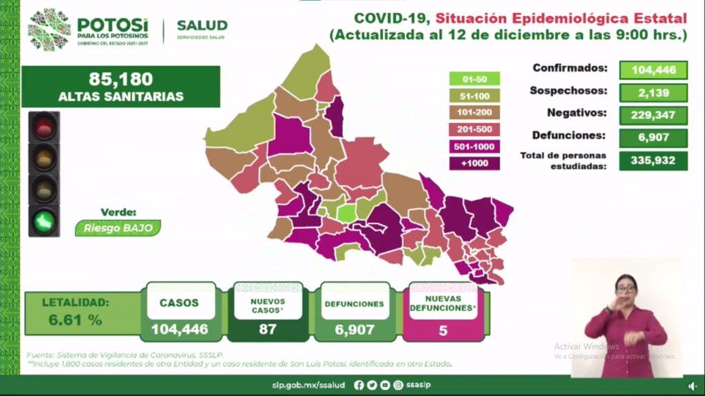 La Secretaría de Salud de San Luis Potosí y el Comité Estatal para la Seguridad en Salud, informan que, hasta este lunes 13 de diciembre, se registran 104 mil 446 casos totales de COVID-19, con la confirmación de 87 nuevos contagios en las últimas 24 horas.