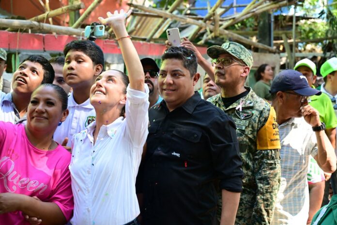 Durante el recorrido, la Presidenta reconoció la respuesta inmediata del gobierno estatal ante la contingencia y participó en la entrega de apoyos directos a las familias damnificadas, incluyendo colchones, estufas, refrigeradores y paquetes alimentarios.