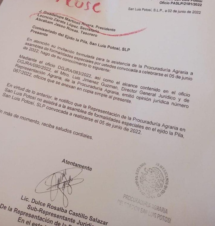 Y fue enviado un oficio de la Procuraduría Agraria al Comisariado Ejidal, donde se le avisa que no se van a presentar en la asamblea, con esto, simplemente no se realiza el evento.
