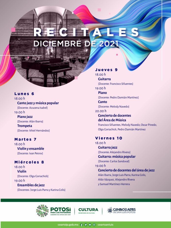 Enmarcada en las acciones de desarrollo académico en las artes promovidas por el Gobierno del Estado y la Secretaría de Cultura, a través del Centro de las Artes de San Luis Potosí, y como parte de los procesos formativos de los diversos programas académicos de esta institución, del 06 al 10 de diciembre 2021, en la Sala de Conciertos, se llevará a cabo la Temporada de Recitales que alumnos del área de música ofrecerán al público, con la intención de dar una muestra del desarrollo artístico logrado durante el último trimestre.