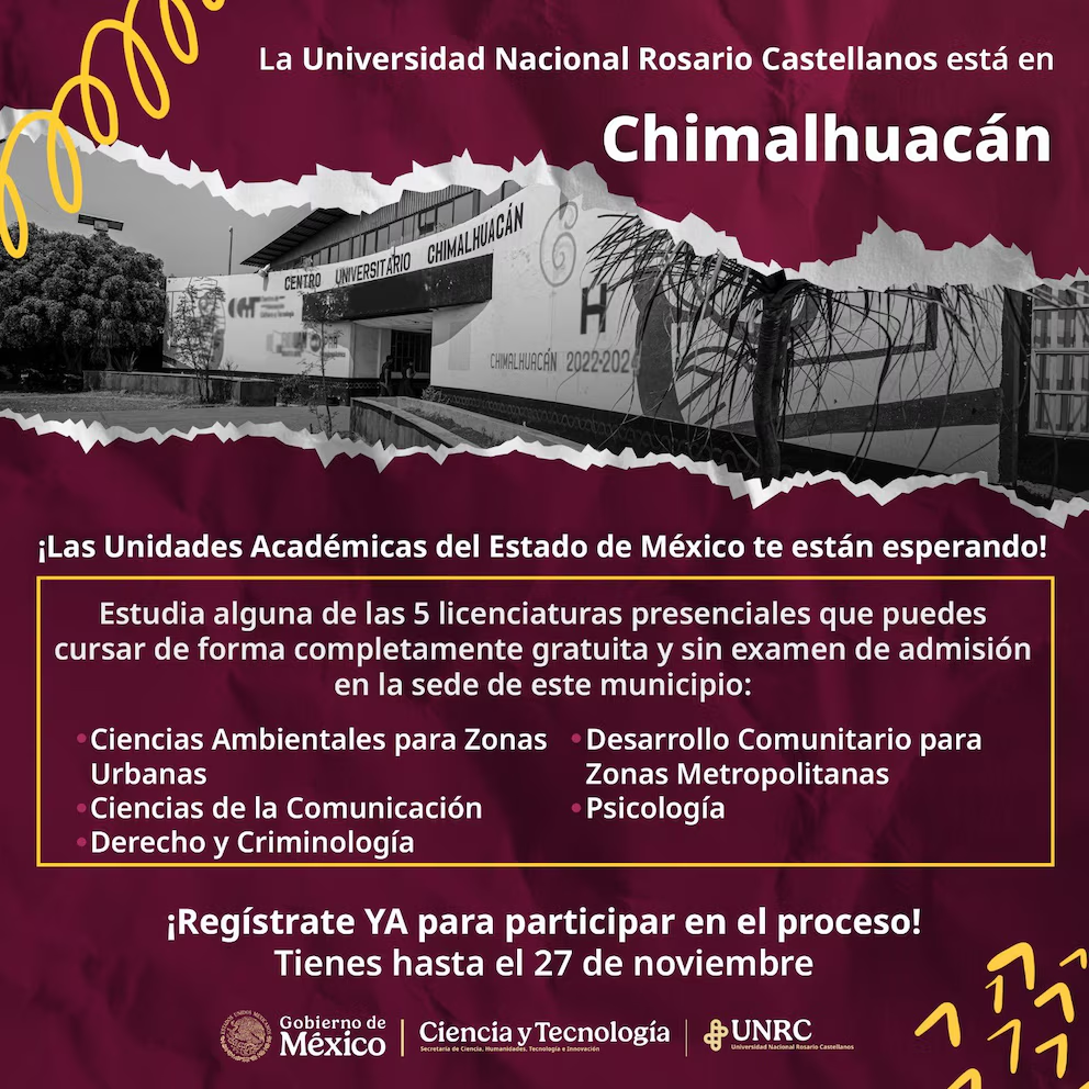 La Universidad Rosario Castellanos (URC) lanzó su convocatoria 2025 para que personas interesadas puedan ingresar a una licenciatura presencial sin presentar examen de admisión.