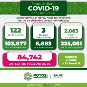 La Secretaría de Salud de San Luis Potosí y el Comité Estatal para la Seguridad en Salud, informan que hasta este lunes 6 de diciembre se registran 103 mil 877 casos totales de Covid-19, con la confirmación de 122 nuevos contagios en las últimas 24 horas.