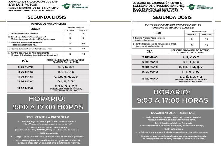 En cuanto la capital potosina, el martes 11 iniciará la aplicación de segunda dosis en personas mayores de 60 años y los mismos módulos de aplicación y en orden alfabético previamente establecido.