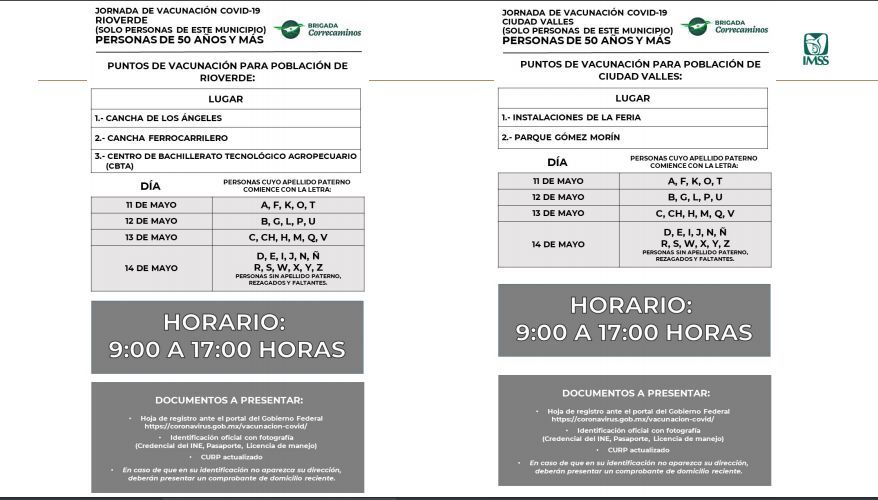 En el municipio de Rioverde la aplicación se realizará en: la cancha de Los Ángeles, cancha Ferrocarrilero y Centro de Bachillerato Tecnológico Agropecuario (CBTA), los días para recibir la dosis serán del martes 11 al viernes 14 de mayo.