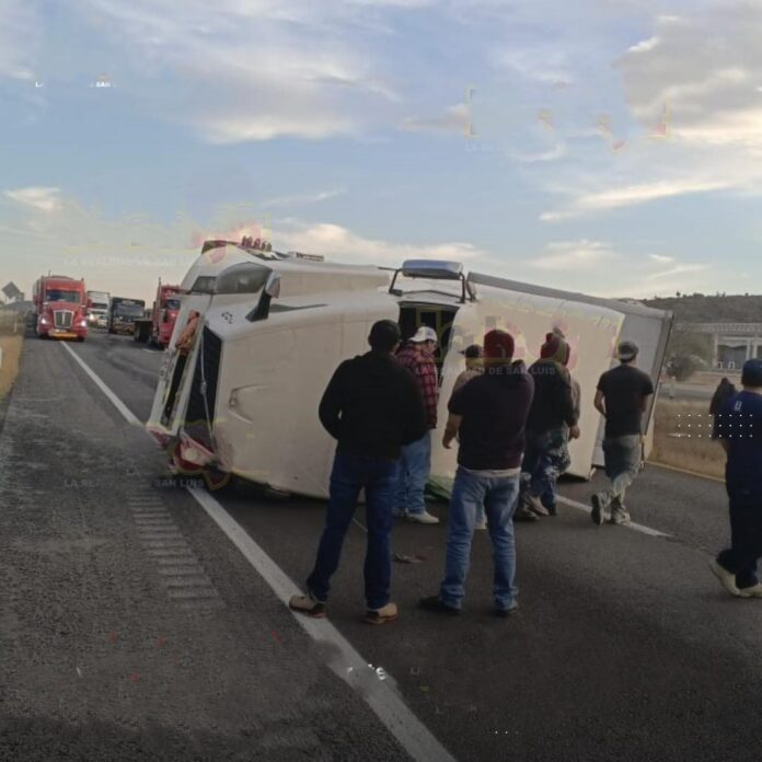 El percance ocurrió frente a la localidad de Cerro Gordo, en los carriles que conducen de Querétaro hacia San Luis Potosí, donde el tráiler perdió estabilidad y quedó recostado sobre la superficie de rodamiento, obstruyendo parcialmente el paso de los automóviles.