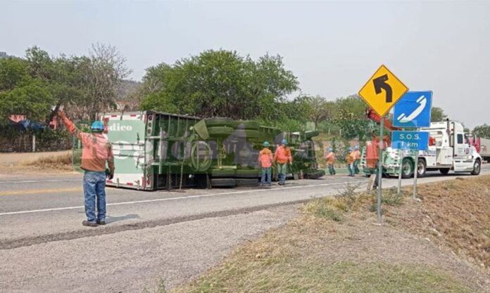 Un tráiler volcó sobre la carretera federal 70 San Luis-Rioverde en el tramo Rioverde – Rayón, generando intensa movilización y el tránsito lento debido a que uno de los carriles fue bloqueado al perder el control de la unidad.