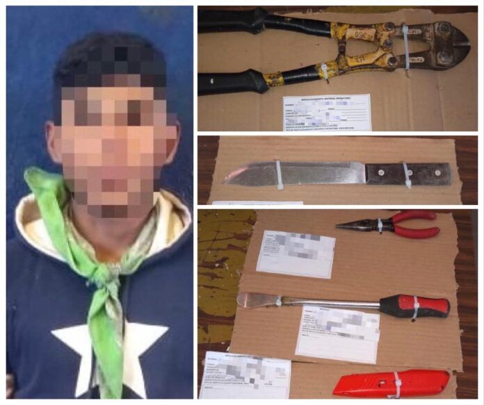Objetos como pinzas, cuchillo, navaja tipo “cutter”, un desarmador y unas cizallas fueron señalados como producto del presunto robo.