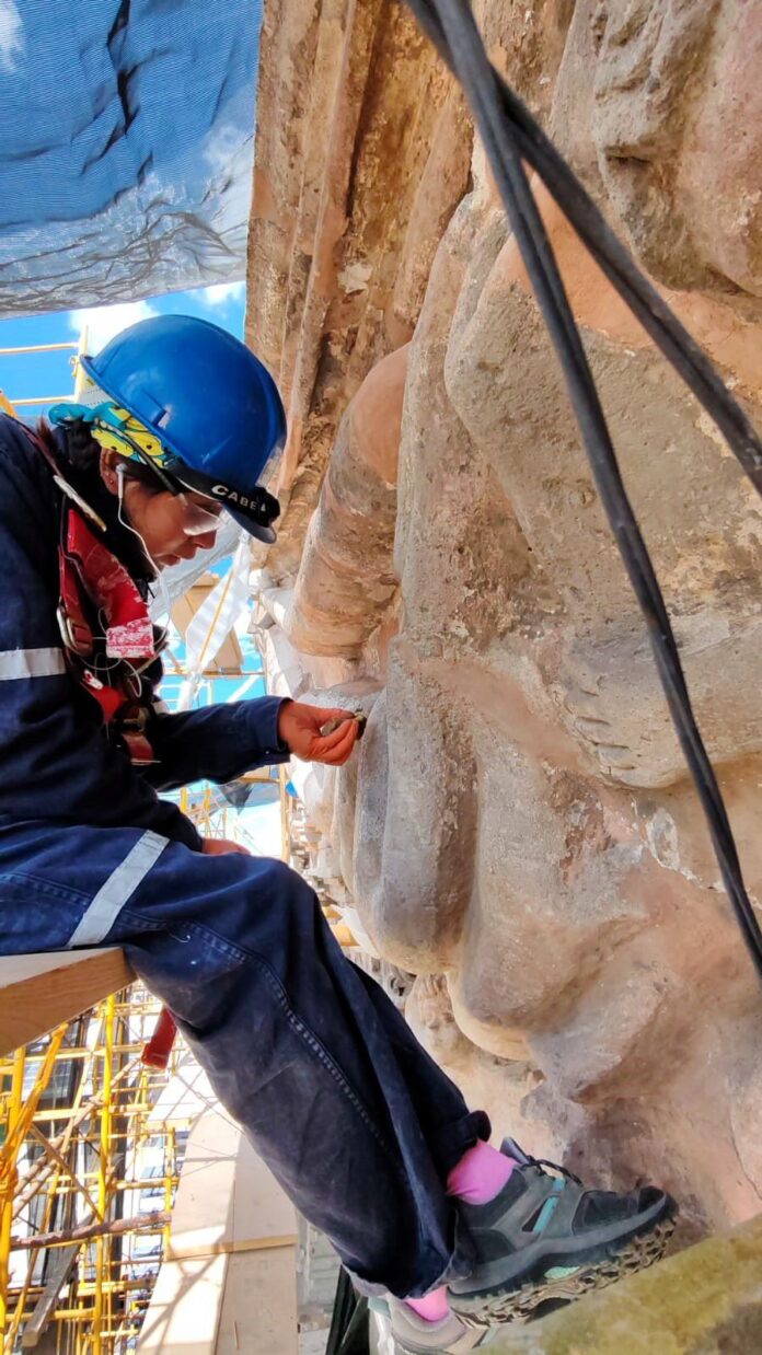 Actualmente, los trabajos consisten en labores especializadas de limpieza y restauración, enfocadas en retirar residuos, manchas y afectaciones provocadas por el paso del tiempo, así como en reparar elementos dañados de la fachada, con el fin de mantenerla en condiciones seguras y preservar su valor histórico y estético para las futuras generaciones.