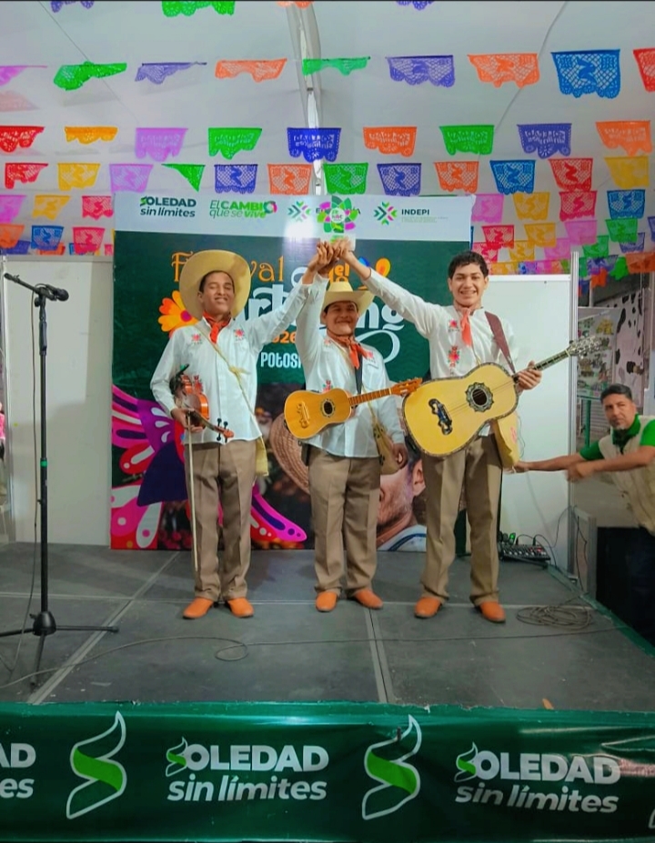 El Trío Alma Vallense, agrupación de huapangueros de los Talleres Artísticos del Centro Cultural de la Huasteca Potosina se presentaron al pasado fin de semana en el Pabellón Artesanal de la Feria Nacional de la Enchilada 2026, en el municipio de Soledad de Graciano Sánchez.