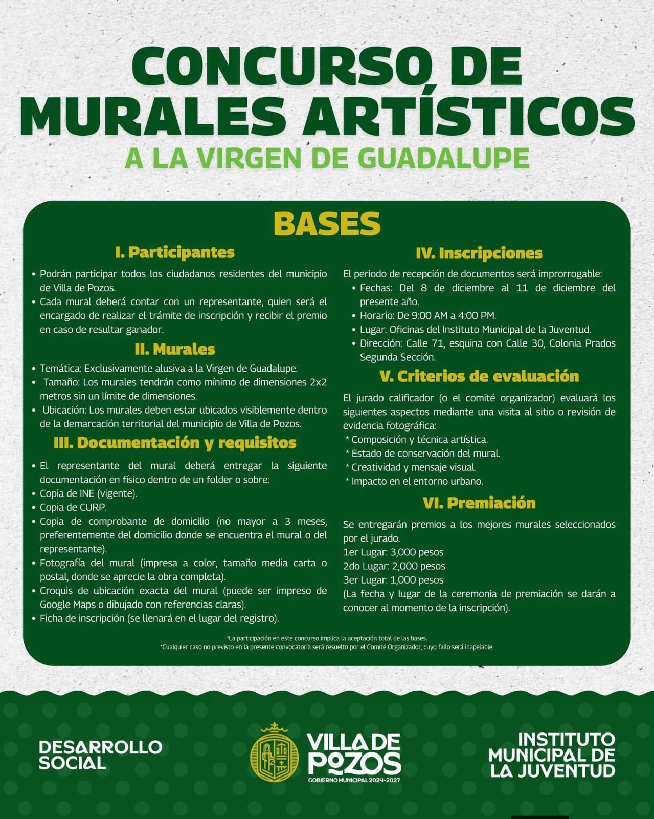 El Gobierno Municipal de Villa de Pozos, a través del Instituto Municipal de la Juventud y la Dirección de Desarrollo Social, lanzó la convocatoria para el Concurso de Murales Artísticos a la Virgen de Guadalupe, dirigido a todos los ciudadanos residentes de la demarcación y cada mural deberá contar con un representante, quien gestionará el trámite de inscripción y recibirá el premio correspondiente en caso de resultar ganador.