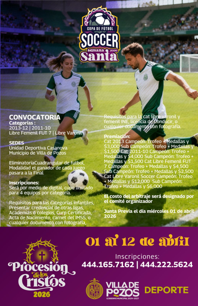 En el marco de las actividades de Semana Santa 2026, el Gobierno Municipal de Villa de Pozos, a través del área de Deporte, invita a la ciudadanía a participar en los torneos de fútbol soccer y pádel, que se llevarán a cabo del 1 al 12 de abril, lo que se consolida en una agenda deportiva integral para todas y todos.
